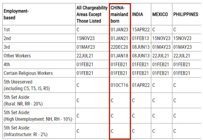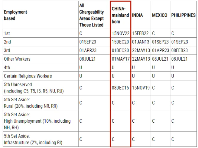 美国国务院签证办公室公布了2025年9月的签证公告(Visa Bulletin),关于职业移民(Employment-based Preference Cases)绿卡排期表详情见以下表格。