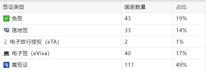 对中国护照落地签的国家和地区总共33个,约占14%。包括沙特、印尼、埃及、尼泊尔和柬埔寨等。具体如下。