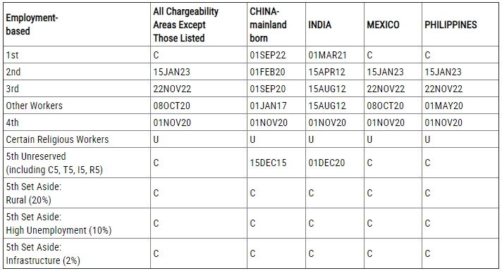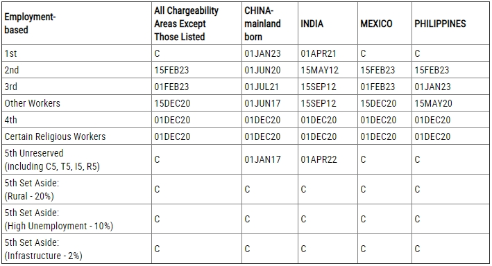 ⭕ EB-4:排期为2020年11月1日,前进11个月; ⭕ EB-5(区域和非区域中心合并):排期为2015年12月15日,原地踏步; ⭕ EB-5(预留类别:乡村、高失业率、基建):无排期。 表A是指有签证名额的排期。表A排期到了,就是说有一张绿卡名额可以签发给你了。当表A日期前进到申请人的优先日期,如果投资人在美国境外,且I-526已经获批,会收到广领馆的面试安排通知;如果人在美国境内,就可以在美国递交I-485转换身份申请了。 表B–递交申请日 (DFA) 据职业移民排期表B,对于中国大陆出生的申请人来说: ⭕ EB-1:排期为2023年1月1日,原地踏步; ⭕ EB-2:排期为2020年6月1日,原地踏步; ⭕ EB-3:技术类专业劳工排期为2021年7月1日,原地踏步;非技术劳工排期为2017年6月1日,原地踏步; ⭕ EB-4:排期为2020年12月1日,前进11个月; ⭕ EB-5(区域和非区域中心合并):排期为2017年1月1日,原地踏步; ⭕ EB-5(预留类别:乡村、高失业率、基建):无排期。 表B是递件排期,仅适用于在美国境内调整身份的申请人;若申请人不在美国,则适用领馆处理,请看表A。国务院发布排期之后,通常几天之内移民局会表态本月是否可用表B。若你在美国境内调整身份,表B排期到了,并且移民局表态当月你所在类别可以使用表B,那么你就可以递交I-485表格调整身份了。若表B不可用,则需要按表A的排期来递交I-485。 2024年美国职业配额的增加是非常利好的消息,EB-5签证预留区免排期项目因无排期+双递交优势继续受欢迎。